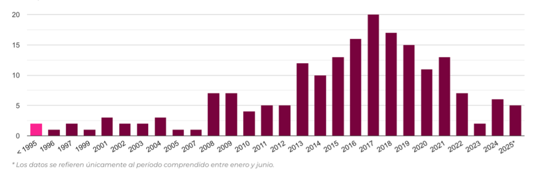 Como muestra el Gráfico 1, el primer pico de medidas AD, a nivel global, se dio en 2016—2017, y dicho patrón vuelve a reaparecer hoy: tras la nueva ola exportadora china, este año se está viendo un repunte de restricciones comerciales al acero chino a escala global, coherente con el recuento de GMK Center de 62 países y 207 medidas activas a inicios de octubre de 2025. Si bien el conteo de casos del presente año no resalta en relación con años anteriores, es importante destacar que dicho conteo solo observa medidas impuestas hasta junio, razón por la cual no registra la medida provisional impuesta en Perú desde el 8 de julio hasta el 9 de noviembre.