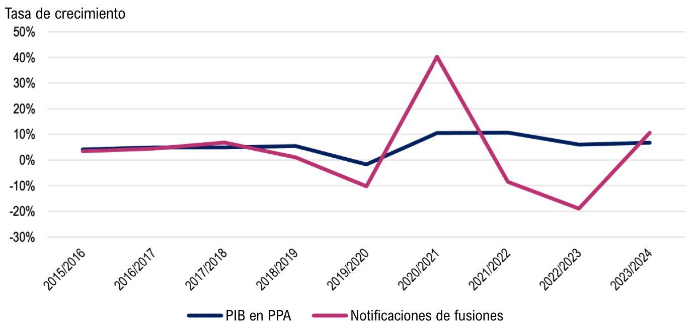 Figura 2. Tasas de crecimiento anual del PIB y notificaciones totales de fusiones de las jurisdicciones de CompStats, 2015-2024