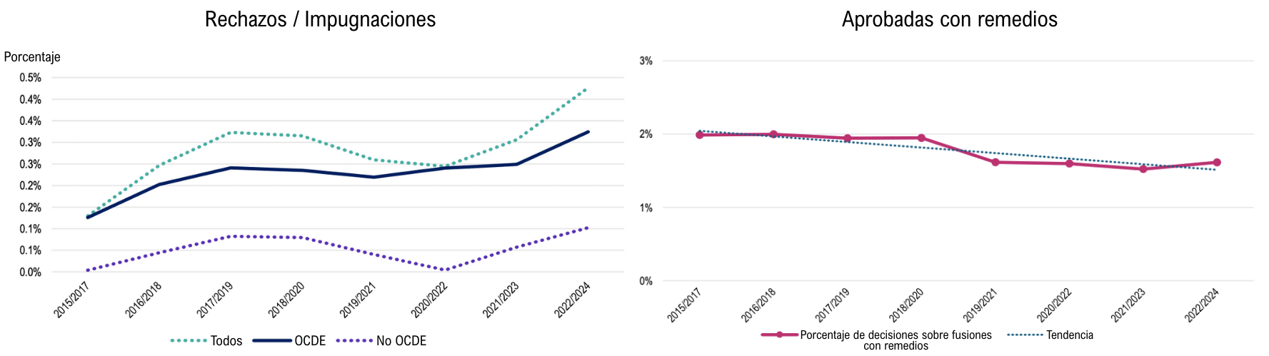 Por otro lado, la tasa promedio de intervención de las autoridades de competencia (que incluye prohibir/impugnar y aprobar con medidas) se ha mantenido relativamente estable en el último decenio (en torno al 4-7%). Pese a esta estabilidad, se observan tendencias interesantes según el tipo de intervención. El número de fusiones prohibidas o impugnadas, calculada como proporción del total, aumentó, especialmente en las jurisdicciones pertenecientes a la OCDE. En cambio, la proporción de decisiones aprobadas con remedios disminuyó ligeramente (Figura 3).