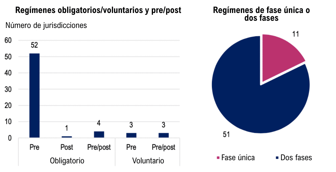 Por último, el Informe OCDE establece que se ha observado un proceso de alineación respecto de los regímenes para el control de fusiones, en el que la mayoría de las jurisdicciones ha optado por un régimen de notificación ex ante, obligatorio y de dos fases (Figura 4). Del mismo modo, la mayoría de las autoridades de competencia utiliza umbrales basados en el volumen de negocios.