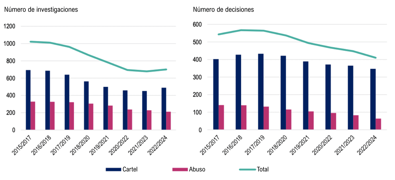 En materia de enforcement contra cárteles y abusos de posición dominante, el Informe señala que tanto el número de investigaciones como de decisiones ha mostrado una tendencia general a la baja en la última década, para ambas conductas (Figura 6).