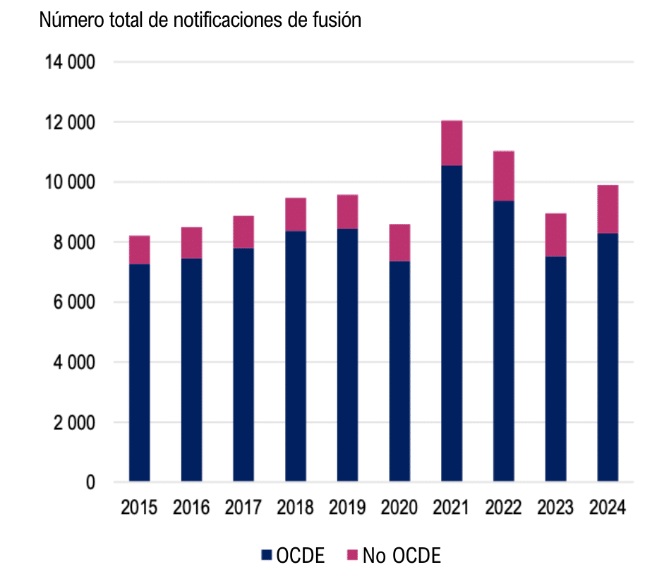Figura 1. Total de notificaciones de fusiones para jurisdicciones de la OCDE y no pertenecientes a ella, 2015-2024