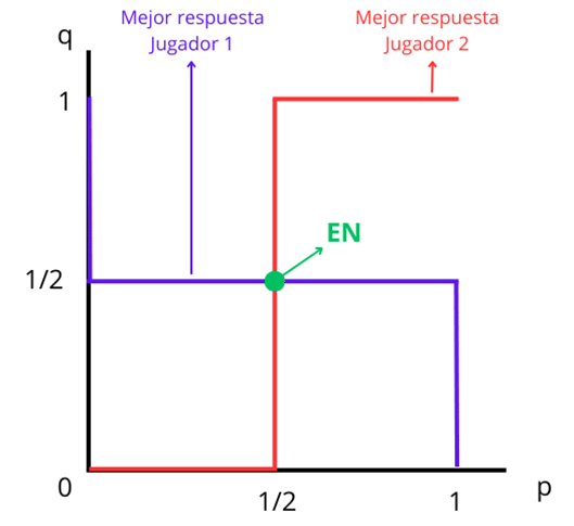 La Figura 1 muestra gráficamente este resultado: las funciones de mejor respuesta de ambos jugadores se interceptan precisamente en el punto (\frac{1}{2}, \frac{1}{2}), el cual constituye el equilibrio de Nash en estrategias mixtas.