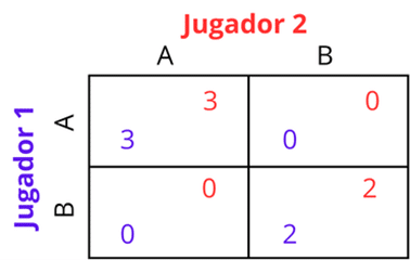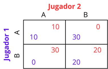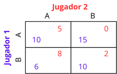 En este caso, los pagos del Jugador 2 se mantienen iguales a los del juego anterior. Por lo tanto, entre sus dos estrategias posibles, A y B, la estrategia A le reporta un resultado superior en todos los escenarios posibles, independientemente de lo que haga su adversario. En consecuencia, para el Jugador 2, A sigue siendo una estrategia dominante. La situación cambia para el Jugador 1. En este nuevo juego, sus pagos son distintos y su estrategia óptima depende de lo que juegue el Jugador 2. Por ejemplo, si el Jugador 2 elige A, la mejor respuesta del Jugador 1 es jugar A (10 > 6). En cambio, si el Jugador 2 elige B, la mejor respuesta del Jugador 1 es jugar B (20 > 15). En este caso, no existe una estrategia que sea siempre óptima para el Jugador 1, su mejor decisión depende de la acción elegida por el Jugador 2.