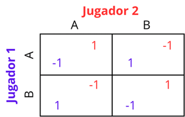 En este juego, si ambos jugadores eligen la misma estrategia (A o B) el Jugador 1 debe pagar un peso al Jugador 2. En cambio, si eligen estrategias distintas, el Jugador 2 debe pagar un peso al Jugador 1.