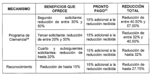63. Ahora bien, esta reducción no debería ser determinada de manera arbitraria. En opinión de esta Secretaría Técnica, la reducción que pueda ofrecerse en un compromiso de cese debería ser compatible con los beneficios que otorgan otros mecanismos de colaboración reconocidos en el TUO de la Ley de Represión de Conductas Anticompetitivas, como son el Programa de Clemencia regulado por el artículo 26, el reconocimiento al que hace referencia el artículo 27 y el pronto pago dispuesto en el artículo 46.6.