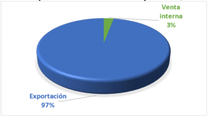 42. Asimismo, de la información descrita previamente, se observa que la producción de harina de pescado es principalmente destinada a la exportación (97% de la producción total); mientras que, el resto se destina a la venta interna de harina de pescado (3% de la producción total)23, tal como se muestra en el siguiente gráfico.