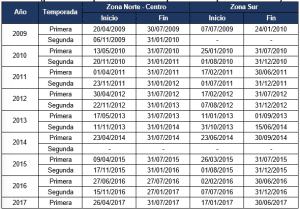 46. En la Tabla 1 se muestran las fechas de inicio y término de las diecisiete (17) temporadas de pesca que corresponden al periodo de análisis del presente caso, comprendido desde la primera temporada de pesca del año 2009 hasta la primera temporada de pesca del año 2017, para las referidas zonas.