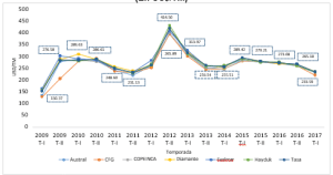 68. Respecto a la evolución de precios promedio por temporada pagado por las denunciadas por la compra de anchoveta, en el Gráfico 2 se observa un comportamiento altamente paralelo entre los precios establecidos por las empresas denunciadas en la mayor parte del periodo de análisis, en particular desde la primera temporada del año 2010 hasta la primera temporada del año 2017.