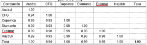 69. Respecto a la correlación entre los precios promedio por temporada pagados por las denunciadas por la compra de anchoveta, en la Tabla 3 se observa que todos los coeficientes de correlación son mayores a 0.9, lo que evidencia un alto grado de correlación positiva entre los precios establecidos por las empresas denunciadas en el periodo de análisis.