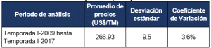 70. Asimismo, se realizó el análisis del coeficiente de variación para medir la dispersión entre los precios promedio por temporada pagado por la compra de anchoveta, observándose en la Tabla 4 que dicho coeficiente de variación en promedio fue de 3.6%37 en el periodo de análisis, lo cual refleja un bajo nivel de dispersión de los precios promedio y, por ende, un comportamiento paralelo de tales precios.