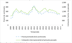 80. A partir del referido análisis, la Sala verifica que la correlación entre el precio promedio por temporada -pagado por la compra de la anchoveta por las empresas denunciadas- y la cotización internacional de la harina de pescado fue de 0.88, desde la primera temporada del año 2009 hasta la primera temporada del año 2017. Este nivel de correlación señala un alto grado de relación positiva entre las variables analizadas. En el Gráfico 3 se observa que el precio de anchoveta por temporada y la cotización internacional de la harina de pescado mostraron una tendencia similar durante el periodo de análisis.