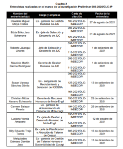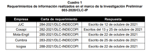 2. Como parte de las actuaciones adicionales, la Dirección realizó requerimientos de información a JJC, Cosapi, Mota-Engil, Cumbra e Iccgsa que fueron atendidos en octubre de 2021, así como entrevistas a diversas personas naturales entre agosto y diciembre de 2021, conforme al siguiente detalle:
