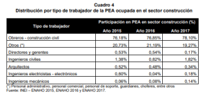 87. Como se ha podido apreciar, la oferta laboral en este sector se caracteriza por contar con una participación mayoritaria de personal obrero y de construcción civil. No obstante, de estos, solo una participación menor son empleados dependientes y solo una pequeña porción cuenta con estudios superiores completos81. En el mismo sentido, el personal administrativo, comercial, técnicos y operarios especializados en el sector representan una menor participación de la oferta laboral. Por último, se tiene que los trabajadores que se desempeñan como personal altamente calificado y de dirección tienen la más baja participación en el sector, por lo que la oferta laboral especializada, calificada y de dirección es reducida en el sector construcción.
