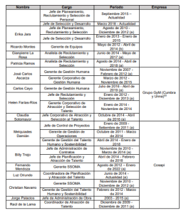 100. Respecto a la Gerencia de Recursos Humanos o Gerencia de Gestión del Talento Humano y Sostenibilidad, se observa que las siguientes personas ocuparon la posición de Gerente durante el periodo investigado:
