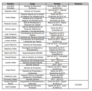 118. Asimismo, en aras de brindar una mejor comprensión de las declaraciones y correos electrónicos que se presentarán a continuación, en el siguiente cuadro se indican los datos de un grupo de personas que participan de manera activa o que son mencionadas en estos medios probatorios , junto con sus respectivos cargos y el periodo aproximado en el que ejercieron sus respectivos cargos: