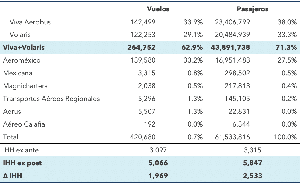 En efecto, el nuevo grupo (Viva+Volaris) se convertirá en el líder en el servicio regular nacional de pasajeros en términos de vuelos realizados y pasajeros transportados, con una participación de mercado durante 2024 de 62.9% y 71.3%, respectivamente. Esta cuota supera el umbral de 50% usado en varias jurisdicciones para presumir poder sustancial (dominancia) de mercado.