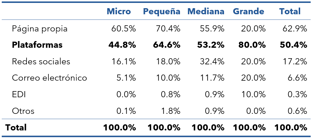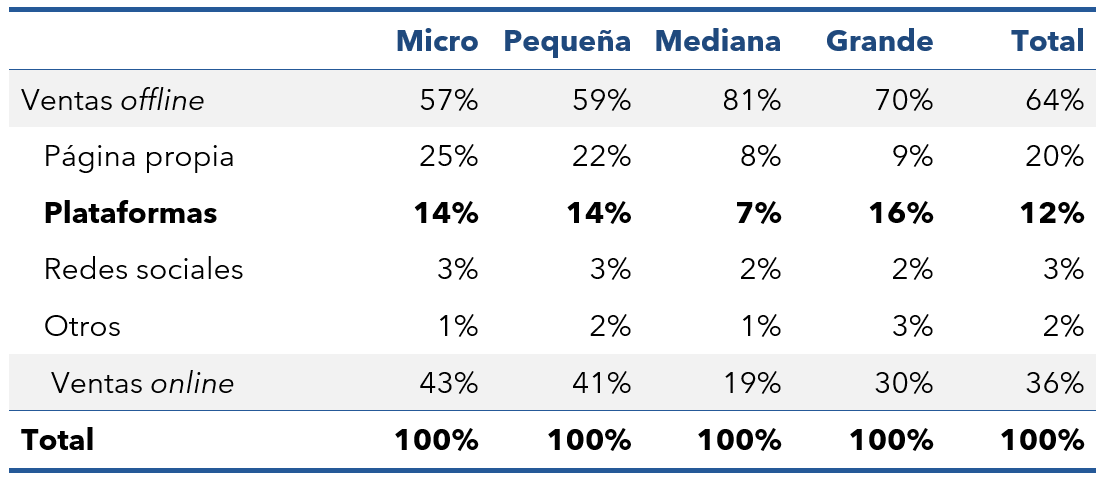 A pesar de la concentración actual, las plataformas aún tienen margen de crecimiento. Según el Cuadro 2, aproximadamente la mitad de las MiPyMEs con ventas online utilizan plataformas, lo que indica una adopción parcial. Esta oportunidad se amplía si se considera el universo de restaurantes con acceso a Internet: solo el 11% de los micro, el 20% de los pequeños, el 24% de los medianos y el 30% de los grandes emplean plataformas como canal de venta.