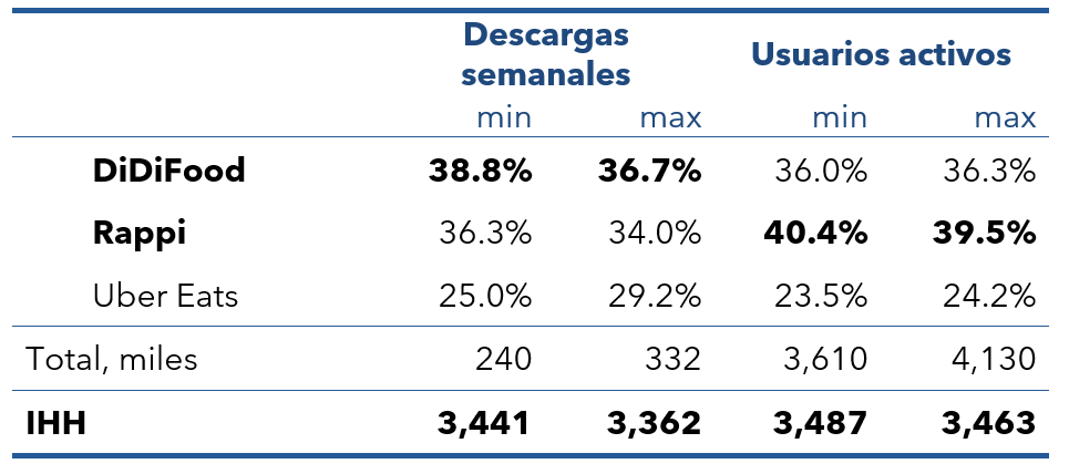 El mercado mexicano de plataformas de delivery presenta un nivel de concentración moderado. Según datos de Sensor Tower, para el primer trimestre de 2024, DiDi Food, Rappi y Uber Eats contaban con cuotas que oscilan entre 25% y 40%, dependiendo de si se mide por descargas o usuarios activos semanales. El índice Herfindahl-Hirschman (IHH) —utilizado internacionalmente para evaluar concentración de mercado— supera los 3,300 puntos en todas las métricas, lo que indica un entorno concentrado.