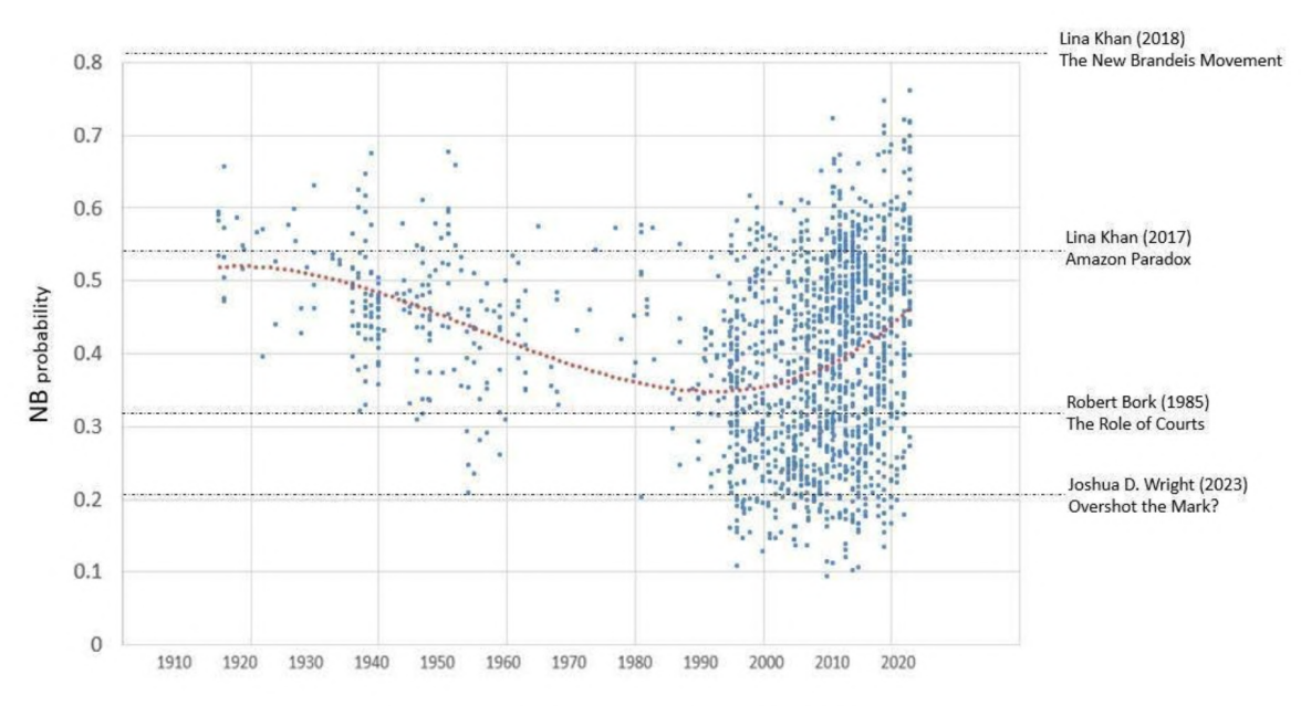 En el artículo original, Mueller aplica esta metodología para asignar un Puntaje NB a cada discurso realizado por comisionados de la FTC, y observar cómo ha cambiado la tendencia del Puntaje NB desde la creación de la institución. Como se puede observar de la Figura 1, en sus comienzos (1910), la curva de puntaje NB era relativamente alta, marcada por la influencia de Louis Brandeis. Luego, con la llegada de la escuela de Chicago, el puntaje NB general de la autoridad bajó, para luego repuntar en los años 2000s con el regreso de autoridades neobrandesianas como Lina Khan.