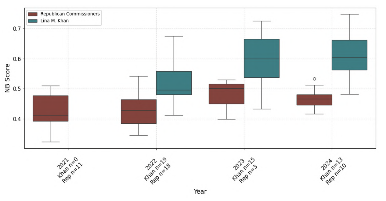 Figura 2: Evolución de Puntaje NB para discursos de Lina Khan vs. comisionados republicanos (2021-2024)
