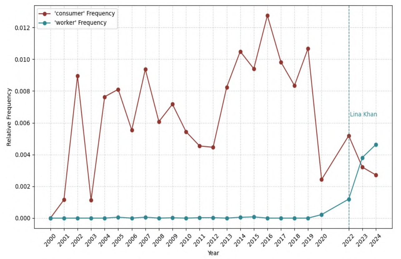 Por otro lado, Norick también refleja el cambio en la inclinación con el mando de Lina Khan al comparar la cantidad de veces que la palabra “empleado” (worker) y “consumidor” (consumer) fueron utilizadas en cada año, como porcentaje de las palabras totales. En este sentido, a partir del año 2020, la proporción para “empleado” creció considerablemente, y en 2023 superó la proporción de “consumidor”. En este sentido, el autor señala que esta tendencia se asemeja con los principios neobrandesianos, al considerar otros actores del mercado distintos a los consumidores.