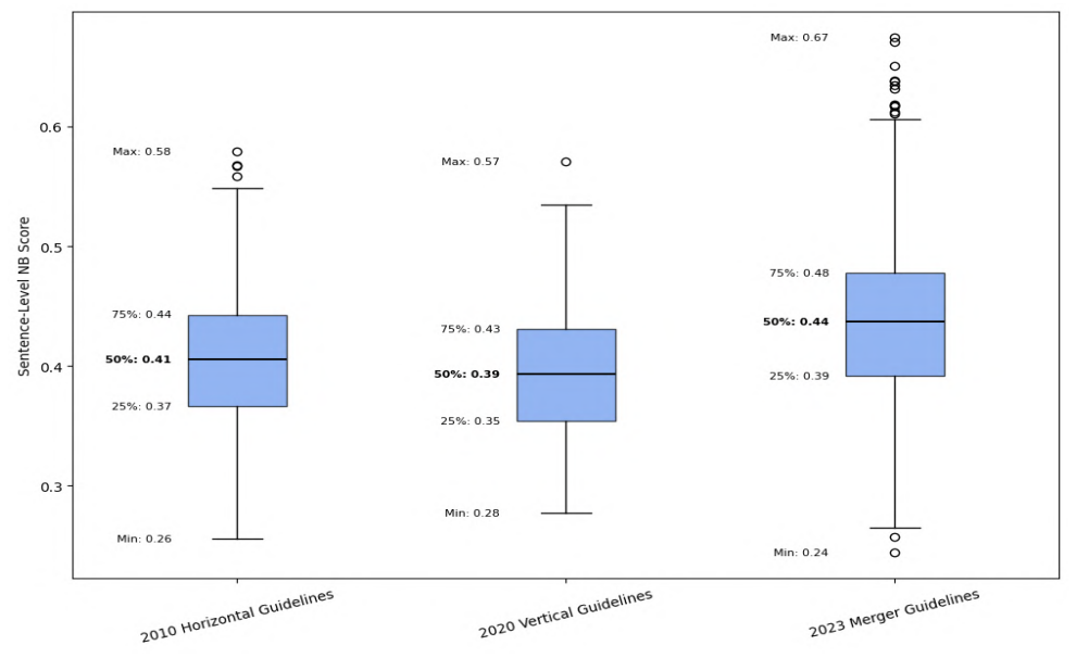 Para profundizar el análisis anterior, Norick aplica el análisis lingüístico para niveles más profundos respecto del enforcement de la autoridad: las guías y las demandas. En cuanto a las guías, compara las guías de fusión emitidas por la FTC en los años 1968, 1982 y 2023, con el fin de evaluar la evolución del uso de lenguaje en dichas guías. Al respecto, y aplicando la misma metodología de Mueller para asignar un Puntaje NB, el autor encontró que, a nivel de frase, la Guías de 2023 presenta una mayor cantidad de frases con puntajes NB altos. En específico, si bien a nivel general no la Guía de 2023 no parece marcar una diferencia tan amplia en términos de puntaje (en comparación a las guías de 1968 y 1982), un total de 15 frases contenidas en dicha guía exceden el puntaje más alto presentado para una frase en las dos guías previas. Esto, de acuerdo con el autor, sugiere que la Guía de 2023 es una demostración de un “empuje” neobrandesiano, más que de una transformación ideológica total.