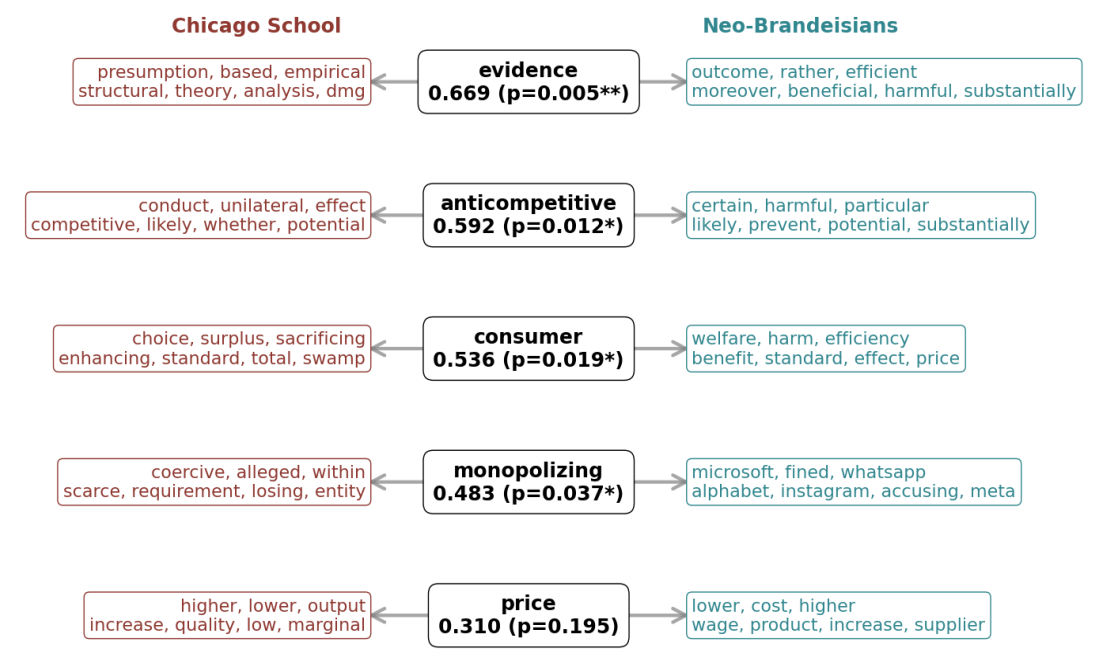 Como muestra la Figura 6, las cinco palabras con mayor distancia semántica relevante —evidence, anticompetitive, consumer, monopolizing y price— ilustran cómo ambas tradiciones comparten, en parte, el mismo vocabulario, pero lo emplean de forma distinta. En efecto, de acuerdo con el autor, mientras la escuela de Chicago tiende a vincular estos términos con categorías técnico-económicas y doctrinales, la escuela neobrandesiana los asocia con teorías de daño, poder y efectos más amplios sobre mercados, trabajadores y proveedores.