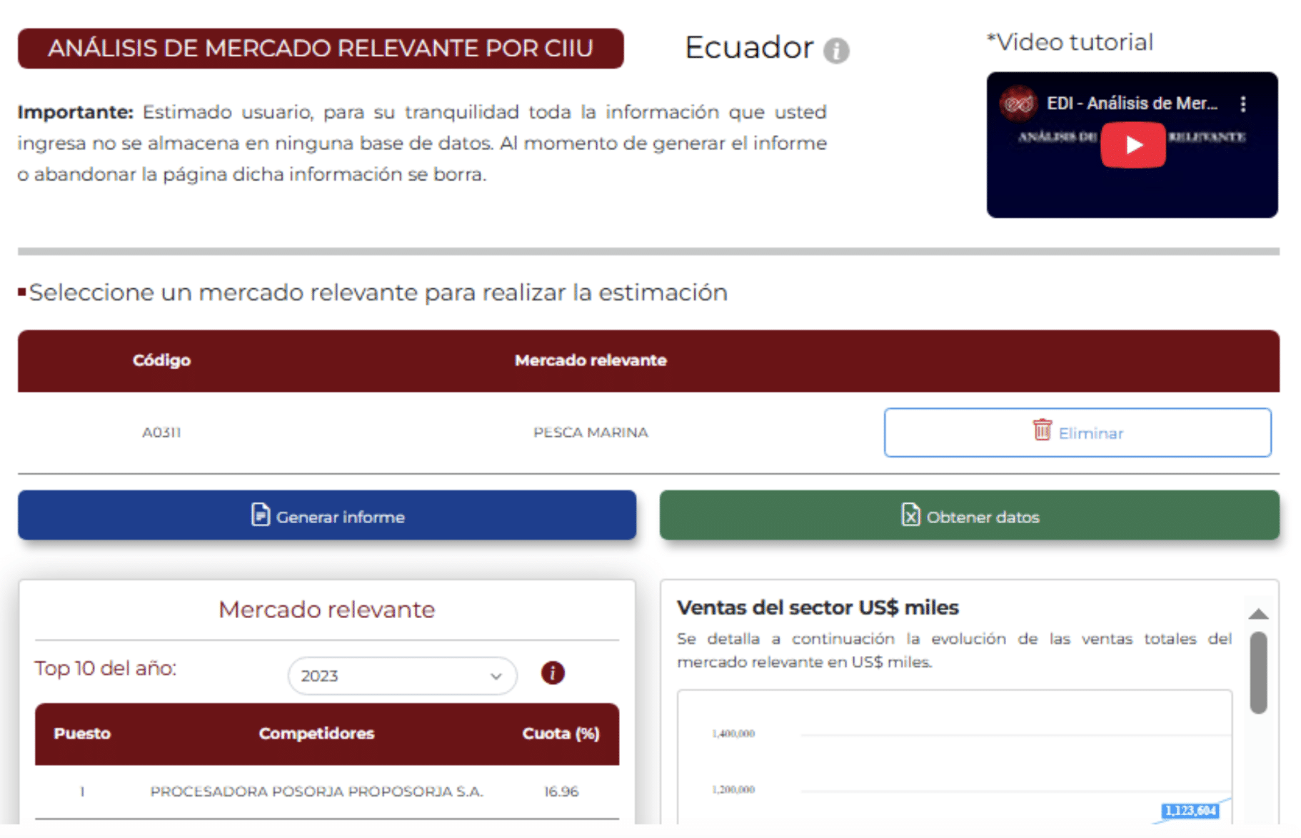 Actualmente EDI se encuentra desarrollada y en funcionamiento para Ecuador, con la información pública de balances empresariales de la Superintendencia de Compañías. Dicha base de datos contiene información de ventas de alrededor de 150 mil firmas ecuatorianas que corresponden a la totalidad del sector formal de la economía. La siguiente ilustración detalla el módulo de análisis de mercado con la clasificación CIIU.
