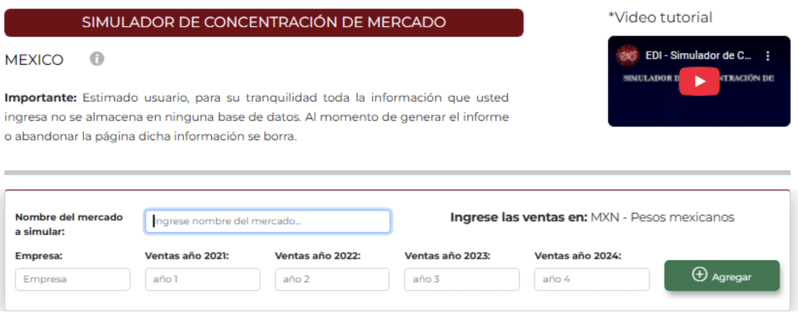 Una limitación que tiene esta herramienta se refiere a la disponibilidad de información. EDI opera en función de la data que se encuentra disponible en su base de datos. Esto pues, en estricto rigor, el funcionamiento de EDI se sustenta en la base de datos que posee. Sin embargo, ante la ausencia de bases de datos de acceso público, es factible la carga de información por parte del usuario. En efecto, el interfaz de carga de información de la plataforma le permite al usuario ingresar los datos que este posee y, de esta manera, generar el mismo análisis que el módulo con base de datos ofrece, es decir las mismas visualizaciones en reportería, y lo más importante, la generación de los informes analíticos de concentración y estructura de competencia de mercado o segmento económico de que se trate. La siguiente ilustración detalla el interfaz de ingreso de datos por parte del usuario para la obtención de los análisis.