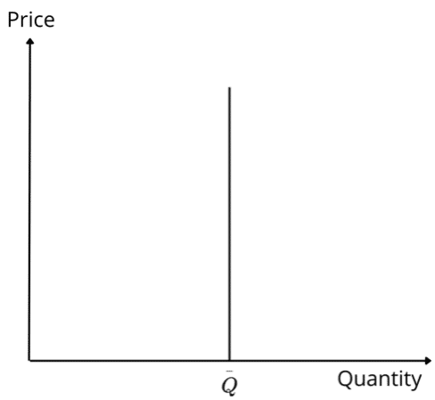 Graph No. 6 illustrates a perfectly inelastic demand curve. In this scenario, the quantity demanded is fixed ( \bar{Q} ), which implies that, at any price, the same quantity of the good is always demanded. For example, essential medicines tend to have perfectly inelastic or “very inelastic” demands, since people are willing to pay any price for a fixed quantity of the medicine (and when they are patented, they often lack substitutes).