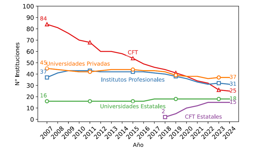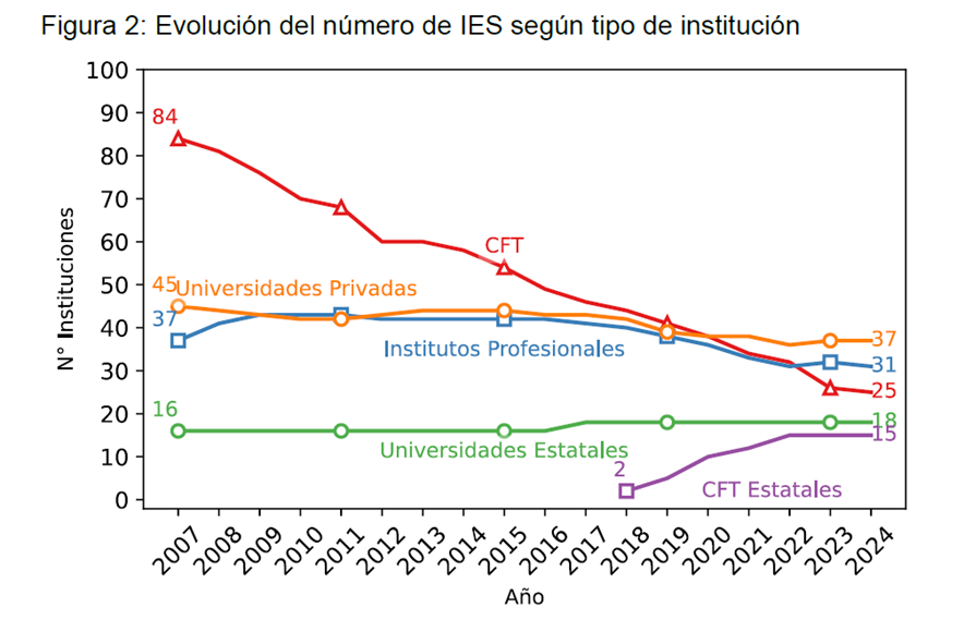 Respecto al número de actores del mercado, un primer hallazgo fue que hubo un importante crecimiento de la cobertura aparejado de una disminución del número de IES (muy marcada en el segmento de centros de formación técnica o “CFT”). En la Figura 1 se aprecia la evolución de la cobertura, plasmando la tasa bruta de cobertura (número de matriculados en educación superior, de cualquier edad, dividido por la población de 18 a 22 años, por lo que puede superar el 100%) y la tasa neta de cobertura (que considera sólo a quienes están matriculados y además pertenecen al rango de 18 a 22 años). Por su parte, la Figura 2 analiza la evolución del número de instituciones.