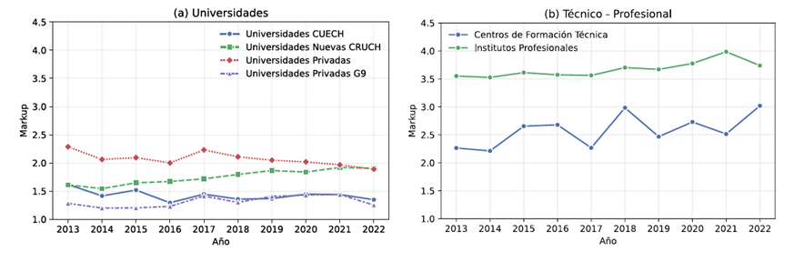 En cuarto lugar, la FNE estudió los markups (la razón entre precio cobrado a los estudiantes y el costo marginal de entregar el servicio de educación). Como el costo marginal de entregar el servicio a un estudiante adicional no es observable, la FNE lo estimó indirectamente: evaluó la sensibilidad de la oferta académica a las variaciones en el uso de insumos de corto plazo, en particular, las remuneraciones académicas (para más detalles metodológicos, ver párrafos 522 y siguientes del Informe). Los resultados (Figura 5) arrojaron: a) que ciertos tipos de universidades muestran una tendencia a la baja en los últimos años, y b) una alta heterogeneidad en los markups, observándose diferencias significativas entre los segmentos del sistema universitario y del técnico profesional y dentro de dichos sistemas.