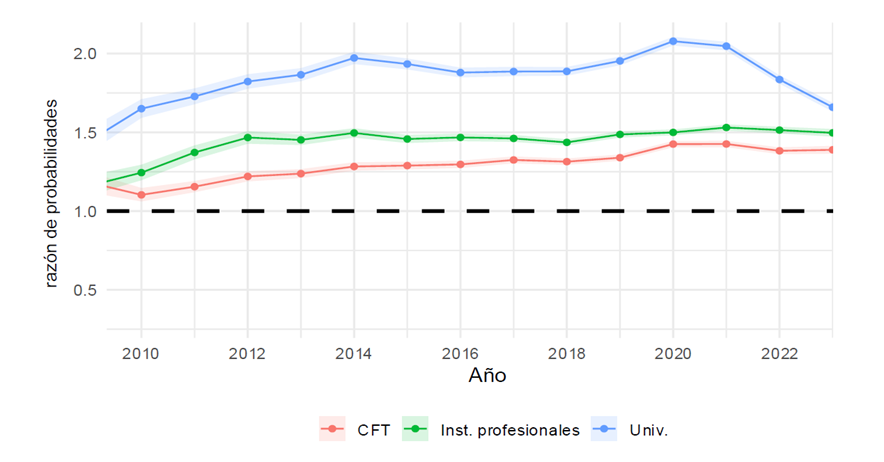 Figura 8: Evolución de la razón de probabilidades del impacto del medio de las carreras en la empleabilidad según tipo de institución
