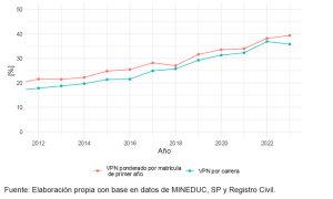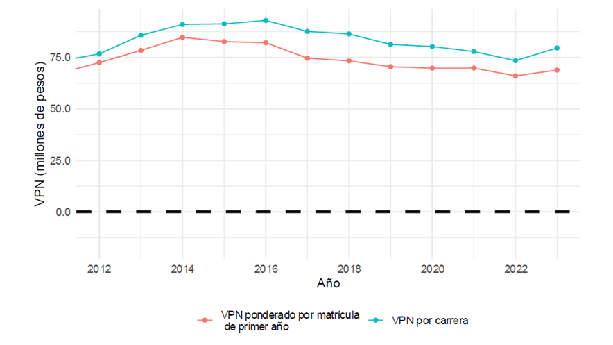 Además, se analizó la evolución del Valor Presente Neto (VPN). Este es una métrica que dimensiona el valor agregado de los programas educacionales (carreras) que se calcula restando los costos económicos de realizar el programa de su beneficio posterior en el mercado laboral. Este beneficio se definió como el flujo de ingresos obtenidos al emplearse después de egresar, mientras que los costos contemplados fueron estos: aranceles/matrícula, costos de titulación y costo de oportunidad (ingresos perdidos al optar por estudiar en una IEs en lugar de ingresar directamente al mercado laboral sin estudiar) (para más consideraciones metodológicas, ver párrafos 662 y ss. del informe).