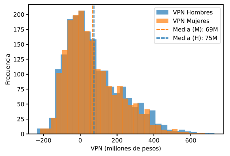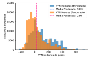 Figura 13: distribución de VPN por carrera ponderado por la matrícula de primer año, según género, para el año 2023.