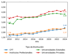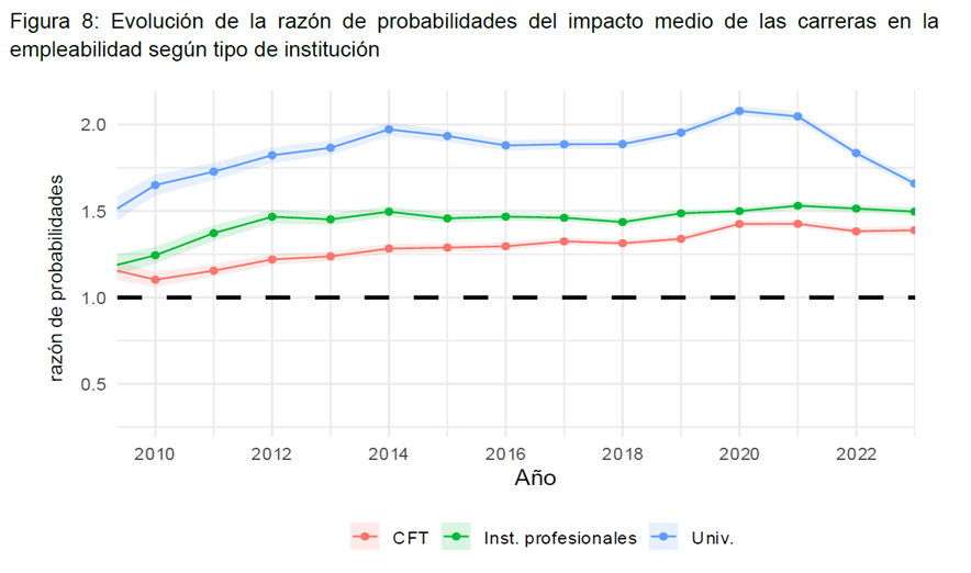Luego, otro aspecto estudiado fue el impacto de estudiar en una IES en la empleabilidad. Esto fue medido utilizando la razón de probabilidades de la empleabilidad: el cociente entre la probabilidad de estar empleado tras egresar de una IES versus dicha probabilidad en caso de no asistir a educación superior. Los resultados mostraron una tendencia positiva, destacando diferencias entre sistemas de educación superior (ver figura 8).