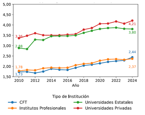 Otro indicador de competencia analizado fue el precio cobrado por las IES. Al respecto, la FNE encontró que el arancel promedio anual siguió una tendencia al alza (ajustada por inflación) para todos los tipos de IEs, tal como se puede ver en la Figura 4.