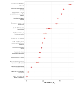 El informe también indagó el proceso de toma de decisión de los estudiantes al elegir una carrera. Un primer aspecto constatado es que las preferencias cambian con el tiempo: la persona que decide qué estudiar no es la misma que la que, luego de terminar la carrera, ingresa al mercado laboral. La encuesta realizada por la FNE a los estudiantes y exestudiantes permite comparar los factores que estos tomarían en cuenta hoy para elegir una carrera (retrospectivamente) versus los que efectivamente se tomaron en cuenta al elegir la carrera. Los resultados mostraron un cambio sistemático: los factores económicos (empleabilidad, expectativa salarial) son sustancialmente más importantes ahora (al ingresar al mercado laboral) que en la decisión original (al elegir la carrera).