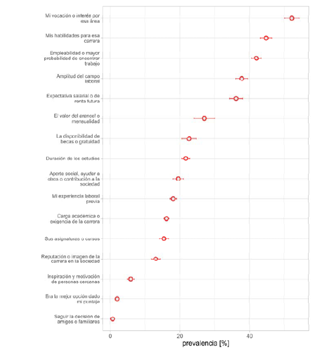 Como se muestra en la Figura 6, la vocación (53%) y las aptitudes para el área (44%) son las características que los encuestados seleccionaron con mayor frecuencia al momento de elegir una carrera.