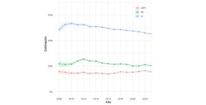 Habiendo identificado las principales determinantes de la calidad, la FNE procedió a analizar su evolución, centrándose en aspectos cuantificables. Primero, para medir el valor agregado de las carreras, analizó la prima salarial, esto es, el efecto en los salarios controlando por factores que podrían estar correlacionados con mayores ingresos (para la metodología, ver párrafos 566 y ss. del informe). Al respecto, se observó que la prima salarial promedio de las carreras universitarias ha decrecido, aunque duplica la de las instituciones TP, cuyos niveles se mantienen estables (Figura 7).