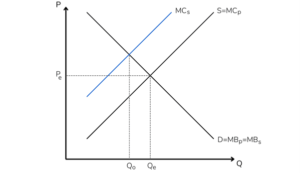 This difference between social and private marginal cost arises because producers do not internalize the negative impact that their production has on the rest of the population. If these effects were considered, costs would increase, causing the quantity produced to fall and reach the socially optimal level (“Qo”), which is lower than the quantity at competitive equilibrium (where only the firm’s private costs are considered), “Qe.” The same logic applies to cases in which negative externalities arise in consumption (there is more consumption than what is socially optimal).
