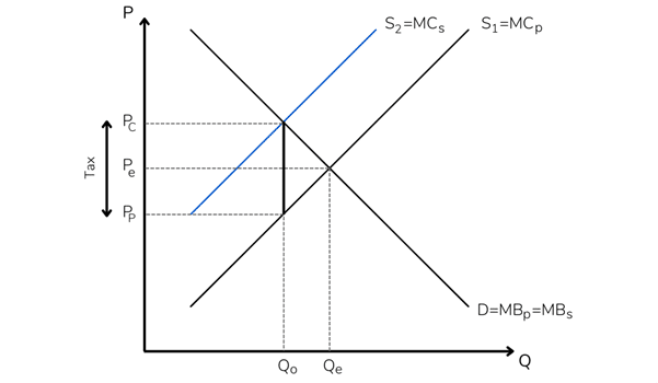 Under this new cost structure, the producer optimizes its production by equating its new supply curve (“S2”) with demand (“D”), reaching a new market equilibrium. The idea is that the magnitude of the corrective tax should be such that, under the new supply curve, the producer maximizes its profit at the same level at which social welfare is maximized (“Qo”). This is what is known as the “optimal corrective tax.”