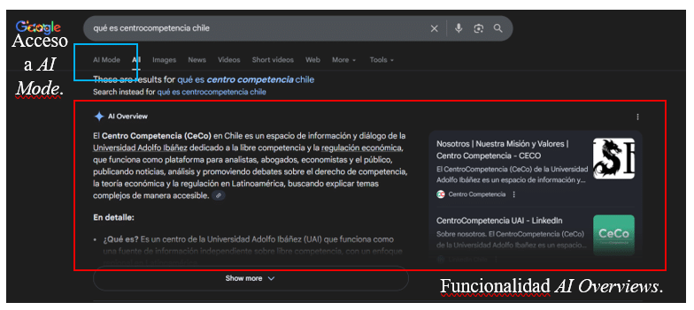 Recientemente, la Comisión Europea incoó un procedimiento sancionador por una infracción de la prohibición de abuso de posición dominante (o de monopolización) contra Google, por la forma en la que entrenó a su modelo de IA para luego integrarlo en sus dos funcionalidades, AI Overviews y AI Mode. Ambas herramientas ocupan un lugar especialmente prominente cuando un usuario realiza una búsqueda: la primera se activa en la parte superior del buscador mostrando una respuesta a la pregunta del usuario, mientras que la segunda aparece como una herramienta disponible justo al lado de la barra del buscador para acceder al modelo de IA directamente, sin ninguna fricción.