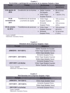 En cuanto a la composición accionaria de la referida empresa, el 99% de las acciones pertenecía a la señora Esther Huamán De Quijada y el 1% restante al señor Víctor Quijada Huamán. Ambos accionistas mantienen un vínculo de parentesco directo con el postor Víctor Hugo Quijada Tacuri, siendo su abuela y su padre, respectivamente.