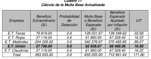 191. (…) se ha actualizado la Multa Base (beneficio esperado) a la fecha de la presente Resolución utilizando el Índice de Precios al Consumidor (IPC), por lo que el monto de las multas ajustadas por inflación ascendería, en total, a setecientos doce mil novecientos sesenta y un con 64/100 (S/ 712 961.64) o ciento setenta y un con 80/100 (171.80) Unidades Impositivas Tributarias (UIT), como se puede apreciar en el siguiente cuadro.