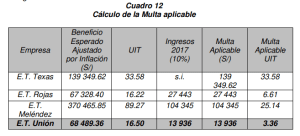 197. En el cuadro siguiente, se puede verificar que el beneficio esperado ajustado por inflación calculado excede al 10% de los ingresos brutos de las empresas E.T. Rojas, E.T. Meléndez y E.T. Unión. En ese sentido, y de conformidad con la Ley, la multa aplicable para estas tres empresas queda fijada según el 10% de los ingresos brutos al cierre del año 2017.