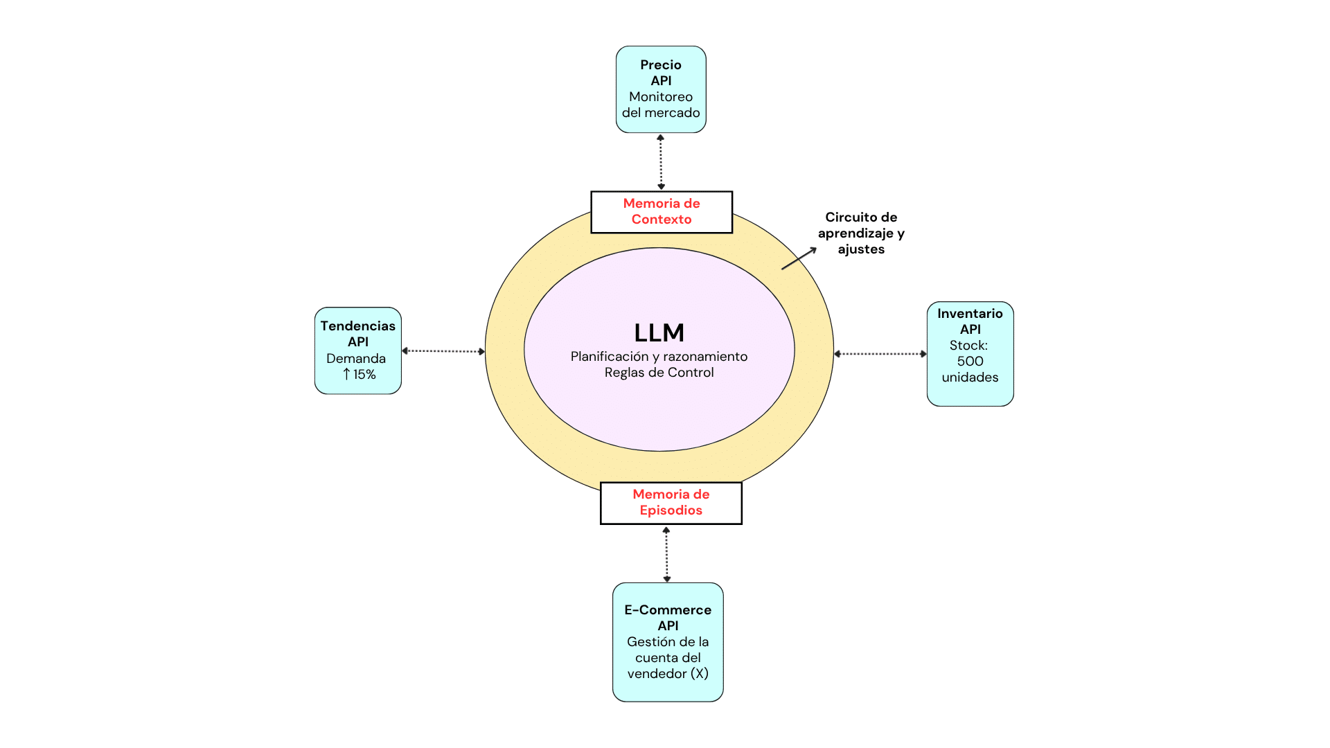 El modelo de Agente exhibido en la Figura 1 integra un LLM, con sus módulos de memoria episódica y de contexto representados en el círculo amarillo, conectado a cuatro módulos externos, entre los cuales existe un constante flujo de intercambio de datos y retroalimentación.