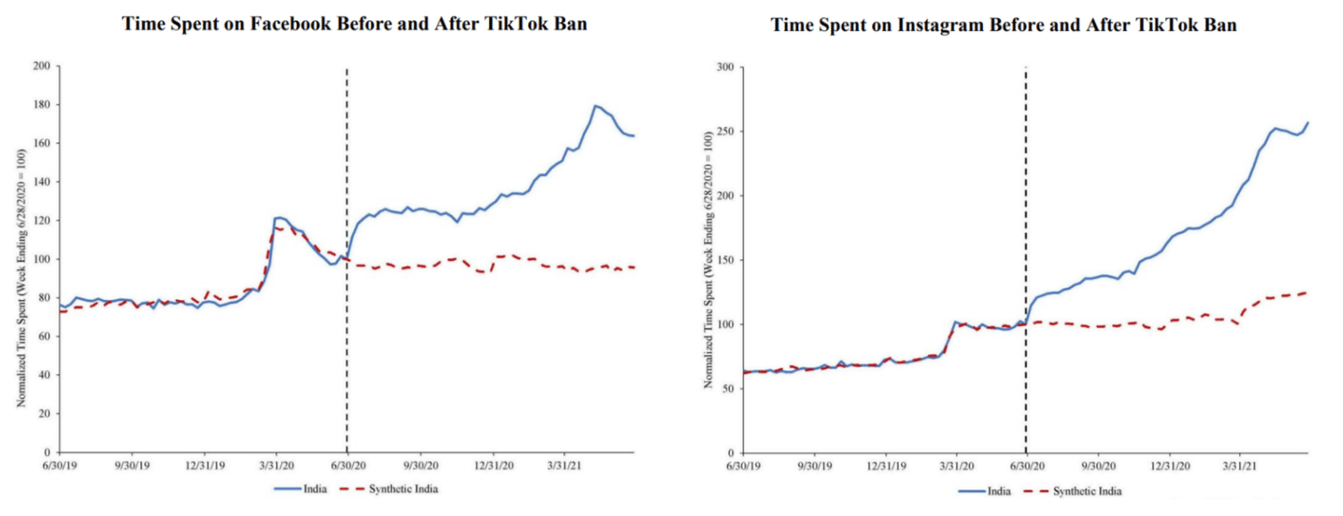 En primer lugar, el fallo documenta cómo la prohibición de TikTok en India en 2020 generó un aumento inmediato y sustancial del uso de Facebook e Instagram, especialmente entre adolescentes. Los datos citados en el juicio muestran incrementos notables tanto en usuarios diarios como en minutos de uso, demostrando una sustitución masiva hacia las aplicaciones de Meta cuando TikTok desaparece. Para reforzar esta evidencia, Meta presentó un estudio con un control sintético, construido por el economista John List (Universidad de Chicago) a partir de la ponderación del comportamiento de varios países para igualar el comportamiento en India previo a la prohibición. Así, logró observar qué habría ocurrido en India si TikTok no hubiese sido prohibido. La comparación entre los datos observados y el control sintético mostró que el aumento en uso de Meta fue causal y directo, reflejado en la Figura 1.